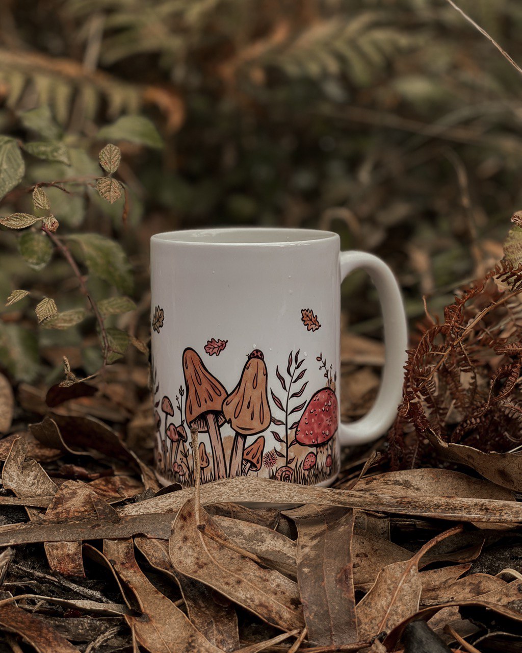 Taza de cerámica inspirada en los anillos de Hadas o Corro de Brujas: portales a mundos feéricos en medio de la naturaleza formados por setas y hongos dispuestos en círculos. Dicen que si los pisas son capaces de hacerte bailar hasta la extenuación además de ser lugar de reunión de toda clase de criaturas mágicas.